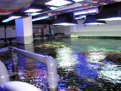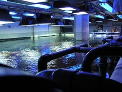 Zum Abschluß war uns noch ein Blick von oben auf das Riffbecken gestattet. 12 Scheinwerfer beleuchten das Riff und sorgen für eine entsprechend hohe Temperatur, die mittels Kühlanlage wieder auf 26°C gebracht wird. Mittels Notstromaggregat kann das Riff bis zu zwei Tage autark betrieben werden.